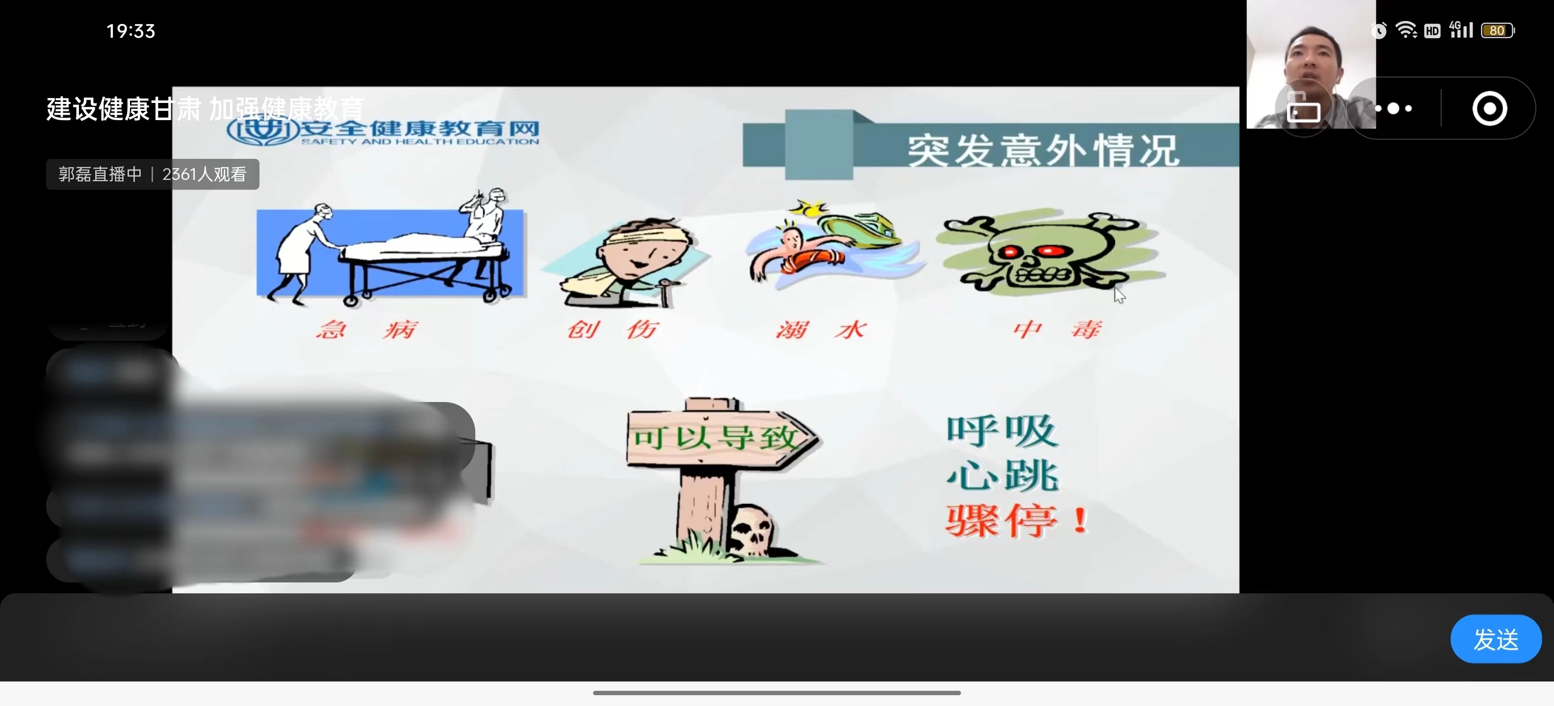 此次講座采取線上直播方式進(jìn)行,由安全健康教育網(wǎng)宣教科主任郭磊主講,郭主任從突發(fā)意外事故應(yīng)急處理及常規(guī)急救技能、對(duì)疫情的正確認(rèn)識(shí)與科學(xué)的防疫方法及心理壓力疏導(dǎo)與健康的生活方式三個(gè)方面內(nèi)容并結(jié)合實(shí)際案例詳細(xì)講述了日常生活中的急救知識(shí)和疫情防控的正確方法。