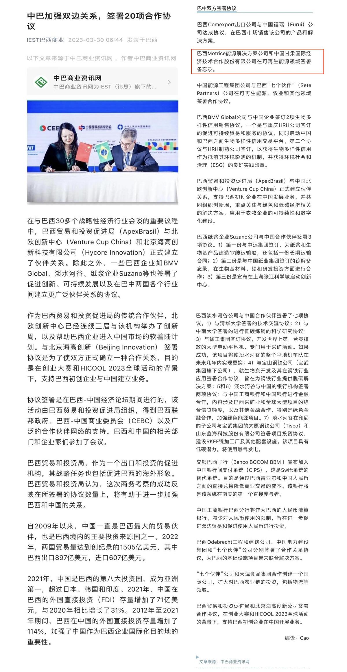 3月29日,巴西新聞媒體Estad?o Conteúdo在其網(wǎng)站上刊登了巴西公司Motrice與中甘國(guó)際可再生能源領(lǐng)域合作協(xié)議簽署的有關(guān)情況。同時(shí),中巴商業(yè)資訊網(wǎng)也對(duì)中甘國(guó)際在巴西—中國(guó)經(jīng)濟(jì)論壇期間該合作協(xié)議的簽訂情況進(jìn)行了報(bào)道。
