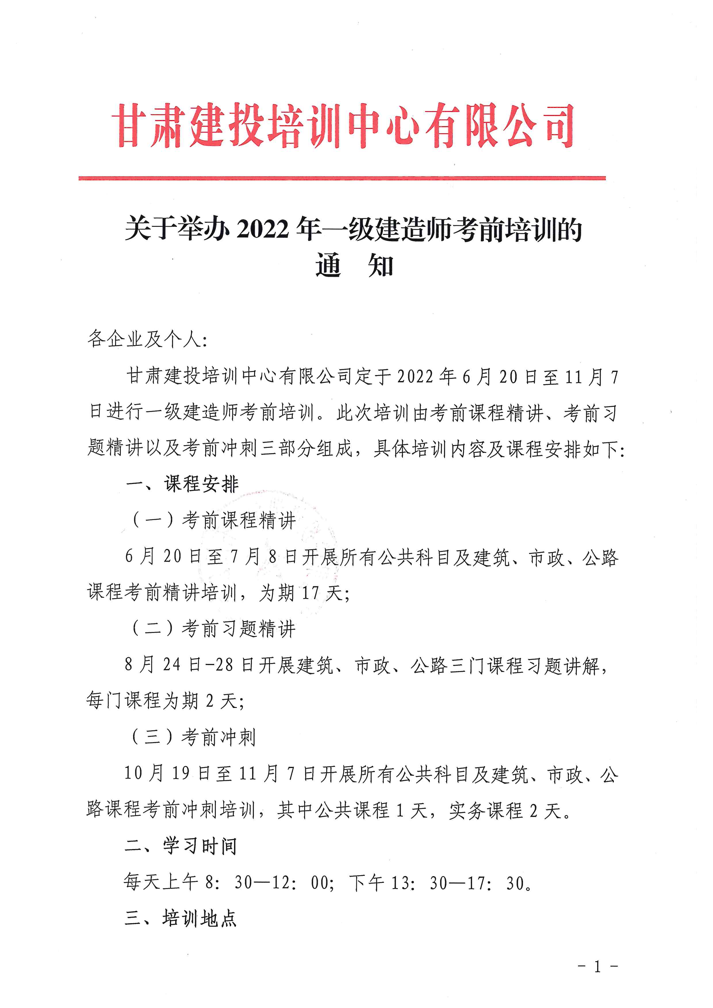 甘肅建投培訓(xùn)中心有限公司關(guān)于舉辦2022年一級建造師考前培訓(xùn)的 通 知