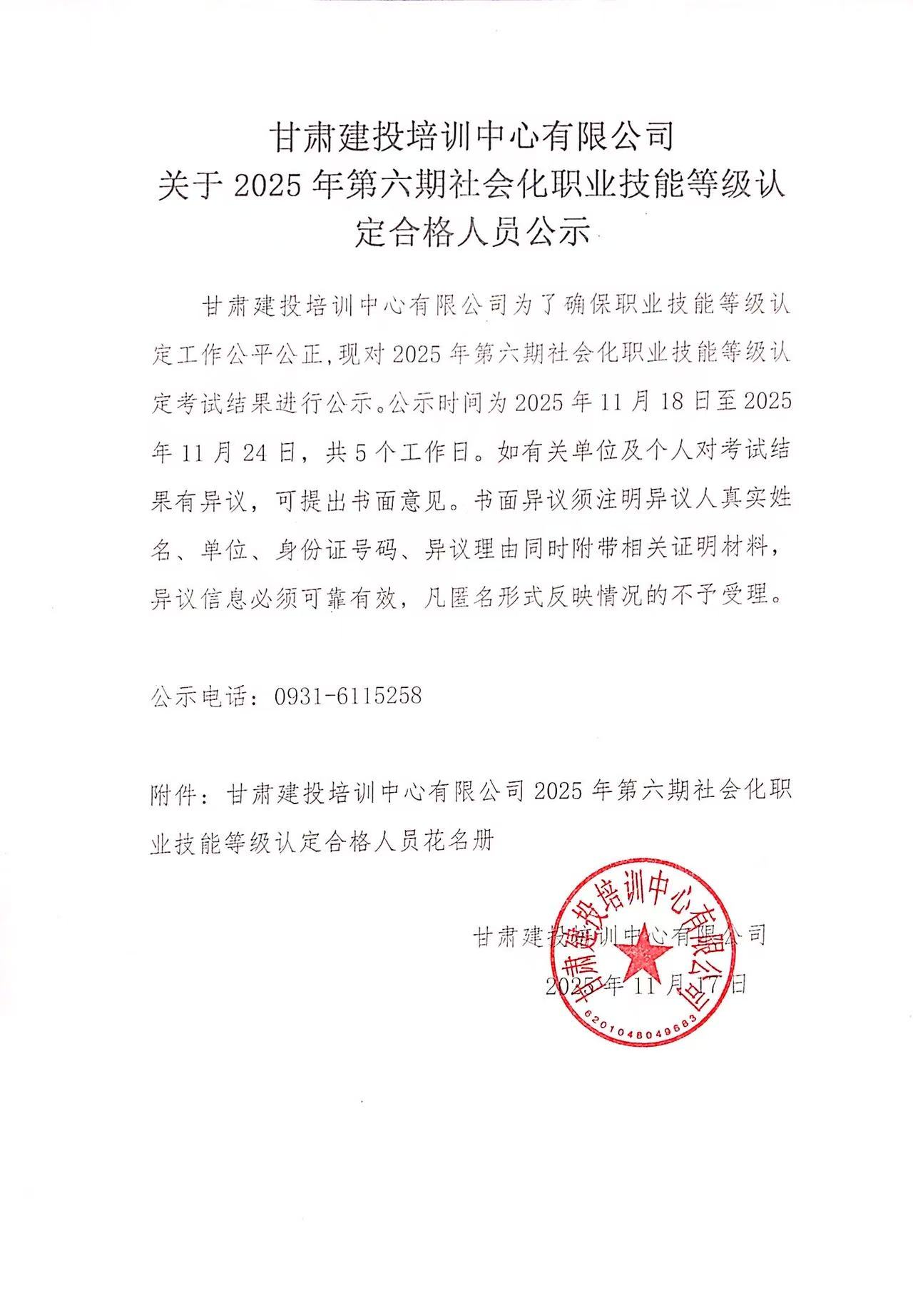 甘肅建投培訓中心有限公司關于2025年第六期社會化職業(yè)技能等級認定合格人員公示